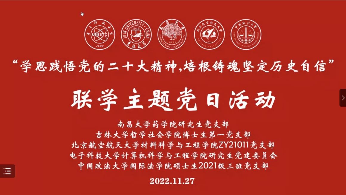 (通讯员:范锡财 耿筱格)为全面学习贯彻党的二十大精神,材料学院ZY21011党支部联合南昌大学药学院研究生党支部、吉林大学哲学社会学院博士生第一党支部、电子科技大学计算机科学与工程学院研究生党建委员会及中国政法大学国际法学院硕士生2021级三班党支部,于11月27日线上开展了“学思践悟党的二十大精神 培根铸魂坚定历史自信”联学主题党日活动。北航材料学院ZY21011党支部耿筱格同志围绕“征程万里风正劲,重任千钧再出...