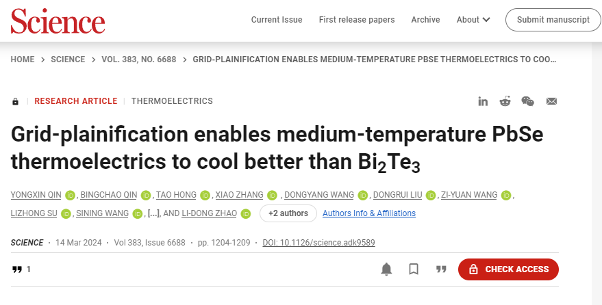 2024年3月15日,《Science》杂志报道了北京亚洲成人在线一二三四五六区材料科学与工程学院赵立东教授课题组在热电半导体制冷材料及器件研究上取得的最新进展:《Grid-plainification enables medium-temperature PbSe thermoelectrics to cool better than Bi2Te3》,该工作提出了一种“grid-plainification(栅格素化)”概念,通过使用物理气相沉积(PVD)生长晶体的方法,以及填补硒化铅(PbSe)晶格中的Pb空位,大幅削弱了晶格缺陷对载流子的散射,实现了载流子迁移率的显著提升。制备的热电器件在室温下实现了73.3K的最大制冷温差,并在420K温差下实现了11.2%的发电效率【Science 383 (2024) 1204-1209.】。北航2018级博士、卓越百人博士后秦永新,北航2019级博士、卓越师资博士后为第一作者;北航前沿科学技术创新研究院副研究员张潇和赵立东为通讯作者,北京亚洲成人在线一二三四五六区材料科学与工程学院为第一单位。这是赵立东教授课题组自2015年以来发表的第9篇《Science》。