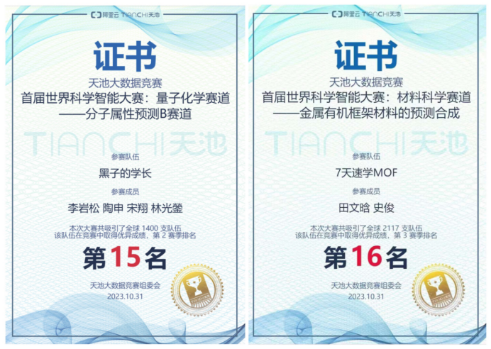 (通讯员 陶申)10月31日,阿里云天池平台联合发布首届世界科学智能大赛阶段性赛季落下帷幕。我校前沿科学技术创新研究院研究生李岩松、陶申、林光鎣、材料科学与工程学院研究生宋翔组成的队伍在量子化学赛道——分子属性预测B赛道的1400支参赛队伍中脱颖而出,取得了第15名的优异成绩;材料科学与工程学院研究生田文晗、史俊组成的队伍在材料科学赛道——金属有机框架材料的预测合成的2117支参赛队伍中脱颖而出,取得了第16名的优异成绩。