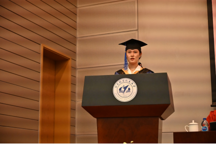 硕士毕业生代表魏舒婷同学发言。她回顾了在北航材料学院求学三年的收获,有勇气、锐气、与豪气。她表示要立志勇做时代的奋进者、开拓者和奉献者,让青春在服务祖国的事业中绽放光彩。祝愿材料学院在七十周年院庆之际再创辉煌,同学们轻装策马青云路。