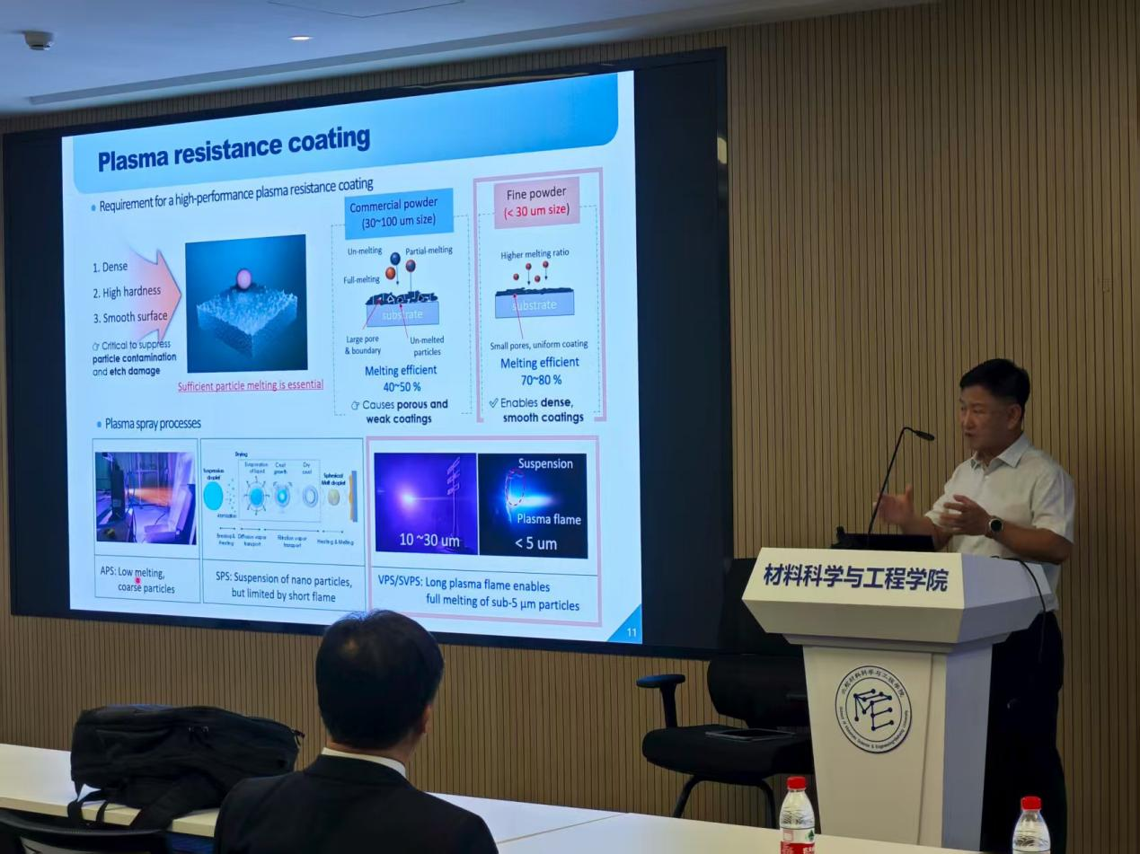 Byon Eungsun教授首先介绍了韩国材料研究院的发展历史组织机构、人才培养、学术交流等基本情况及研究院在热喷涂领域的贡献及最新的研究进展。随后,Byon Eungsun教授围绕真空悬浮等离子喷涂技术在制备抗等离子体烧蚀涂层中的应用展开生动的学术报告。