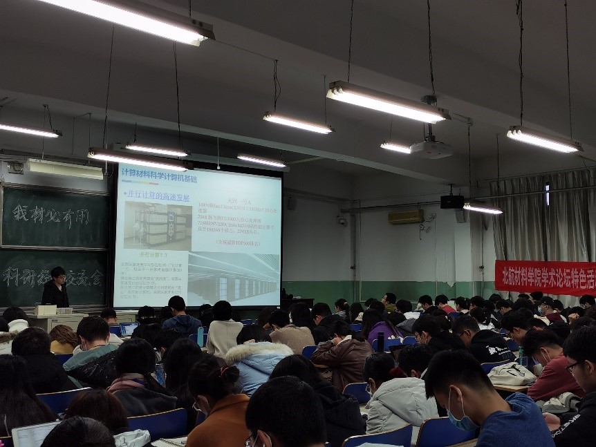 接下来是2016级博士研究生张世毫分享了研究课题“第一性原理计算和材料力学性能”。张世豪博士首先对计算材料学进行概述,计算机科学作为近20年飞速发展的新兴交叉学科,融合了物理学、化学、材料学、计算机科学、数学等多个相关学科,在计算模拟方面具有成本低、安全性高等一系列优势,在新材料和器件设计、晶体结构预测、缺失相图的预测构建和研究材料力学行为方面已经成功应用。与之相关的是美国前总统奥巴马宣布启动的 “材料基因组计划”,其概念由国际人类基因组计划演化而来,主要目的是加速新型材料的研制和应用步伐,最终绘制出材料结构与物性的分布图谱,建立快速、便捷、高效的新材料研发环境,张世豪博士详细介绍了材料基因组计划在国内外的发展现状,同时通过举例C和BN多型力学性能高通量筛选以及镁合金和锌合金固溶强化和成分设计,阐明了材料力学性能的高通量第一性原理计算技术的概念。最后张世豪博士向在场同学们的未来选择提出建议:首先要明确目标,无论工作还是深造,一定要深思熟虑而后实行。其次是选对研究方向和前沿课题,要忠于爱好,基于自己的爱好和擅长进行选择,同时要根据设定的目标多进行相应的实践,但无论选择为何,都要坚定的走下去。