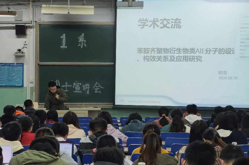 2020年10月28日下午16点,材料学院第十七届学术论坛博士宣讲会在一号楼317成功举办。此次宣讲会邀请到陆浩博士和于跃东博士为同学们讲解相关的研究课题,共计199名同学参加了此次活动。