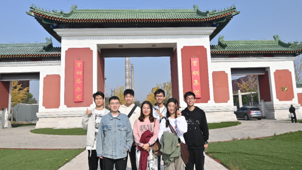 随后同学们来到群明湖畔。群明湖是原首钢冶金生产中用于冷却水储存的晾水池,后跟随工业转型升级,是展现首钢节能环保与园林绿化有机融合的一处胜景。透过芦苇荡遥望湖面的波光,回想起解放前的首钢,历经军阀时期的战乱惊扰,历经日寇侵占时期的压迫欺辱,老一辈首钢人流血牺牲、奋勇抗争,正是他们的负重前行,换来了如今中国的繁荣昌盛,国泰民安。在群明湖结束学习后,大家缅怀先辈,感慨万千,来到首钢南门集体合影留念。